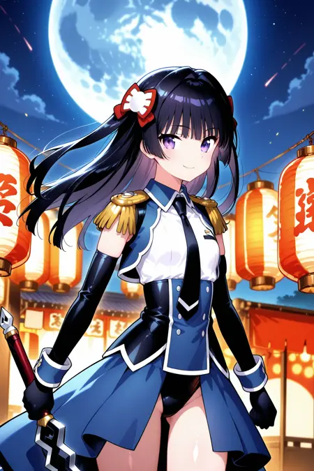 mule la more, purple eyes, black hair, long hair, two side up, hair bow, hair ornament, hair ribbon, red bow
