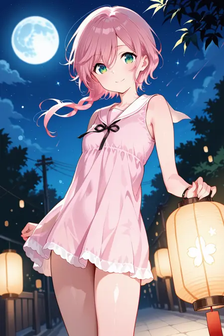 nightgown, pink pajamas, pink dress, black ribbon, bare shoulders, sailor collar, sleeveless shirt