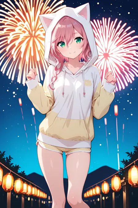 animal hood, cat hood, hoodie, white hoodie, yellow pajamas, animal ears, cat ears, fake animal ears, hood up, long sleeves, yellow short shorts