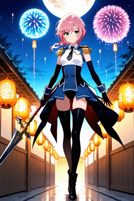 saint dorthress battle dress, battle dress, blue dress, leotard dress, white shirt, epaulettes, sleeveless shirt, collared shirt, black necktie, short necktie, shoulder strap, detached sleeves, elbow gloves, black gloves, blue skirt, high-low skirt, long coat skirt, open front skirt, showgirl skirt