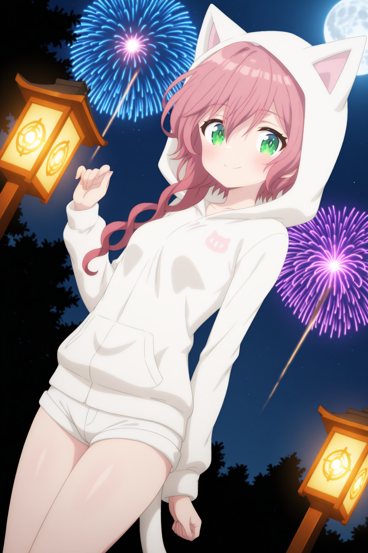 animal hood, cat hood, hoodie, white hoodie, yellow pajamas, animal ears, cat ears, fake animal ears, hood up, long sleeves, yellow short shorts