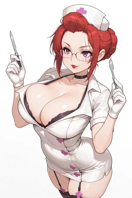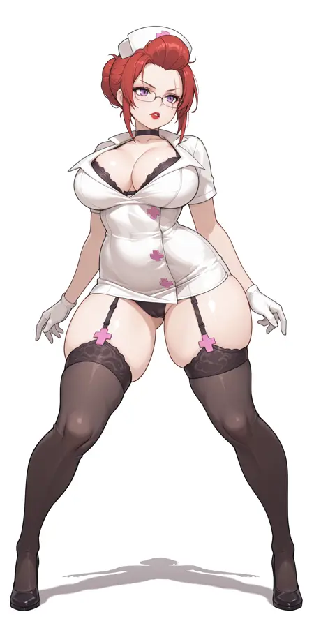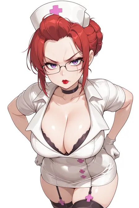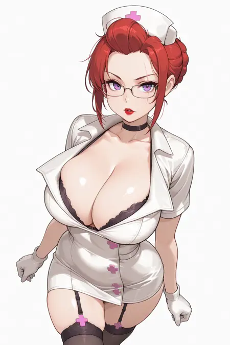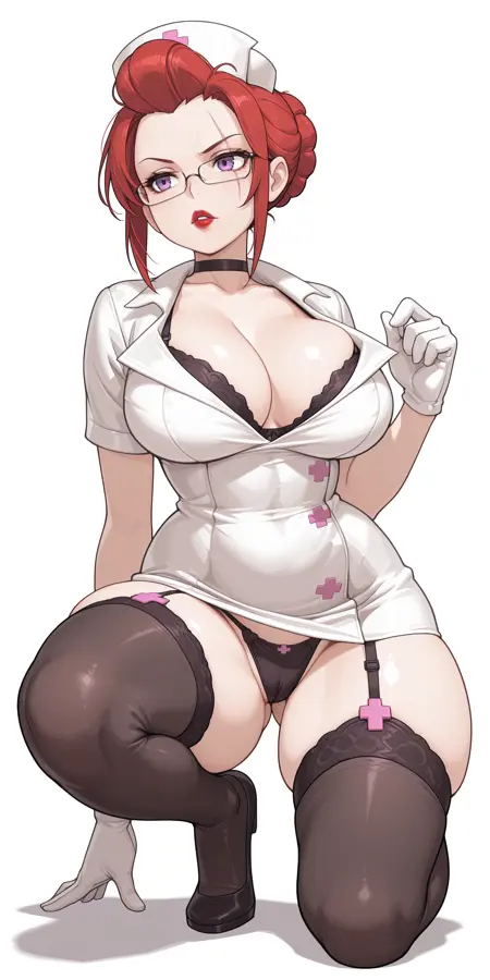 Nurse, nurse cap, red hair, hair bun, purple eyes, eye scar, glasses, lipstick, nurse, nurse cap, large breasts, black bra, bra peek, garter straps, black thighhighs, white gloves, black heels, thigh id card,