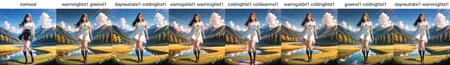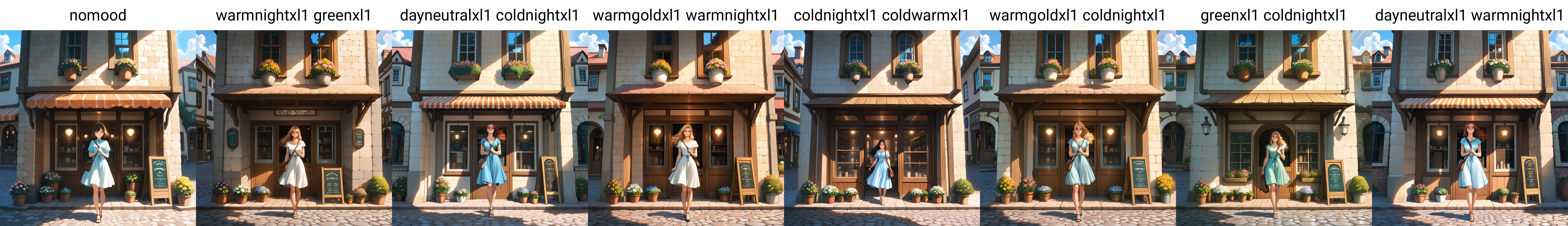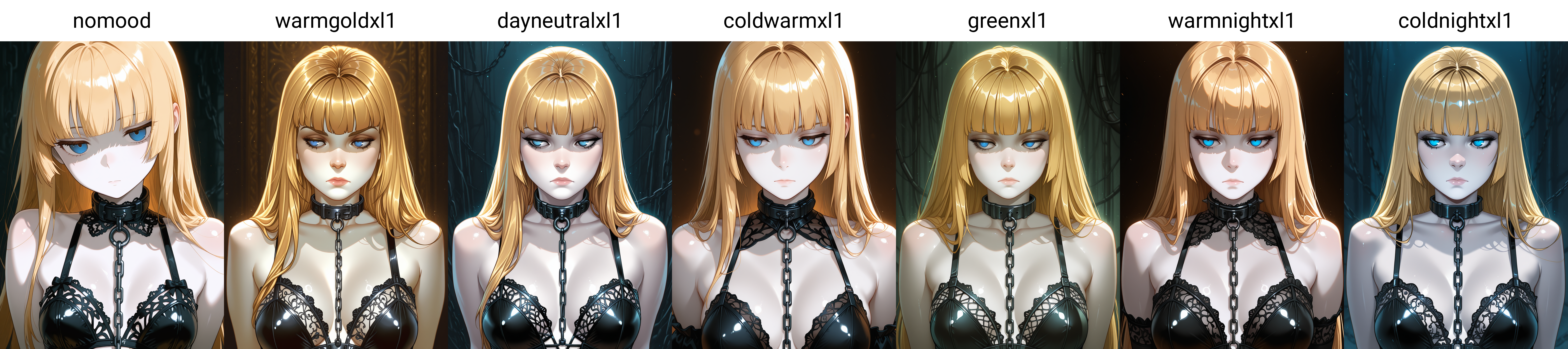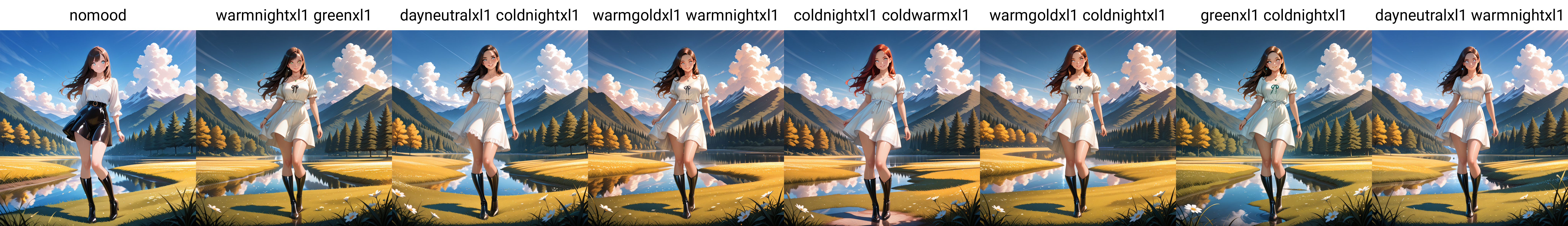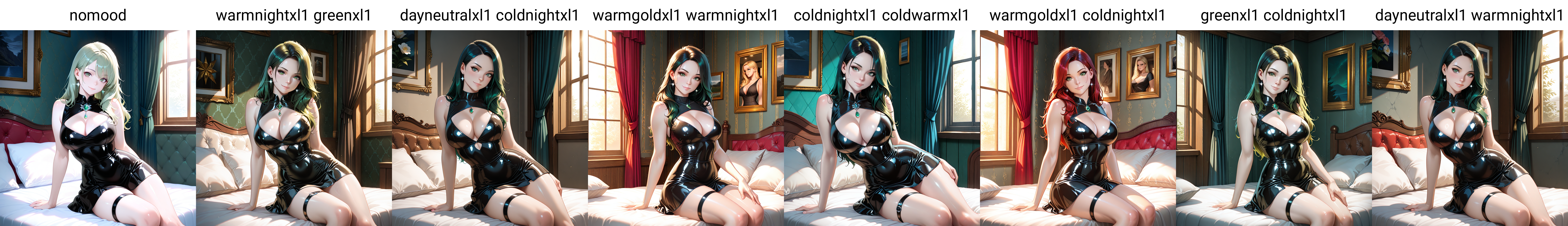 warmgoldxl1,dayneutralxl1,coldwarmxl1,greenxl1,warmnightxl1,coldnightxl1다른 스타일 LoRA와 별도로 또는 겹쳐 사용해도 색상이 흐려지지 않습니다.