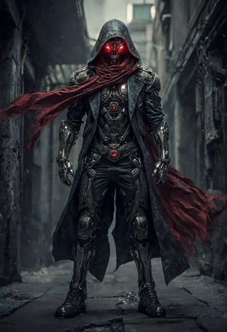 「ほこりっぽいサイバー放浪者、フード付きコートととげのあるアーマー、赤く光るビジー、雨に濡れた小路、シネマティックなバックライト。」