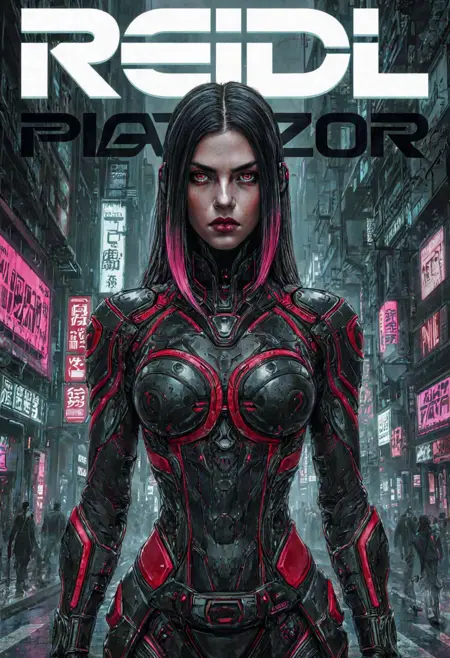 なし。「とげのあるアーマー」、「グリティなサイバー放浪者」、「工業的なコクピット」、「赤いHUDの光」、「スプラッターポスター背景」、**「重いグリーブルとケーブル」**といったフレーズで導いてください。