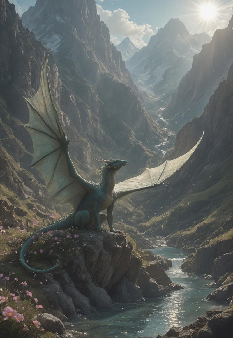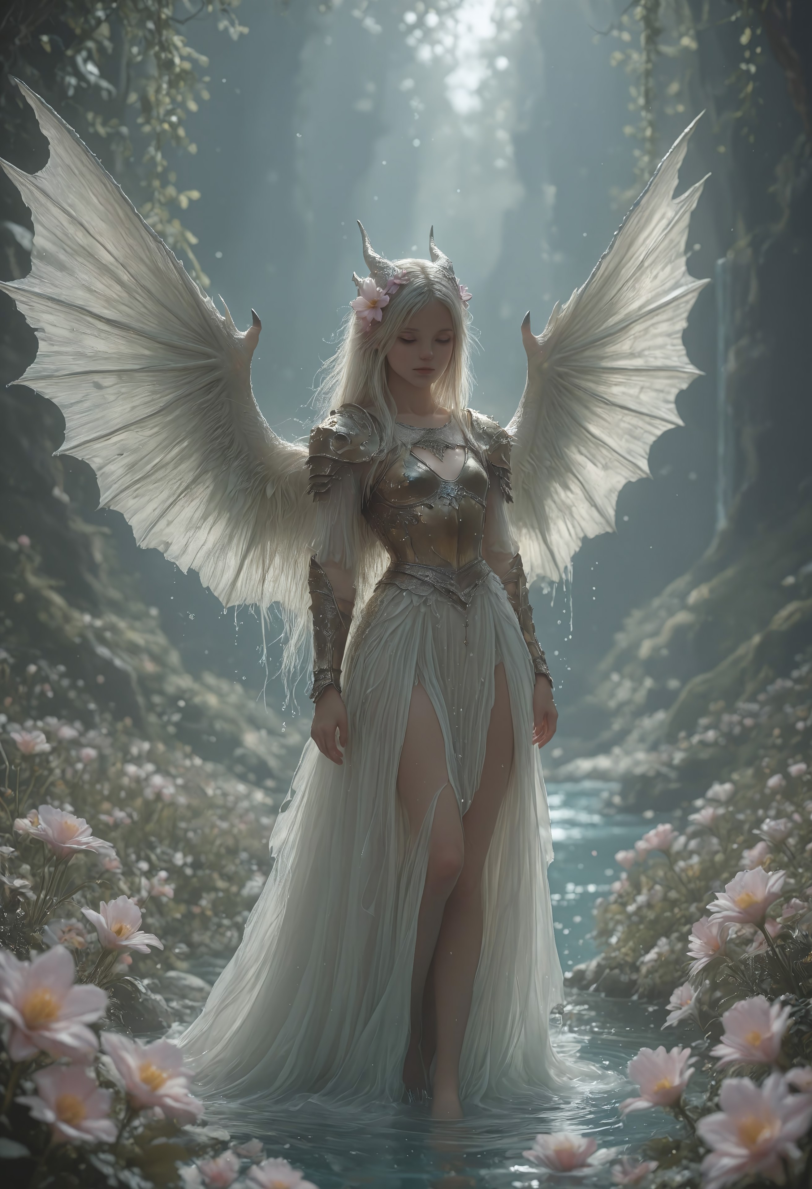 빛의 힌트를 포함한 프롬프트: “sunlight, glowing aura, radiant highlights, shimmering water, luminous flowers”.