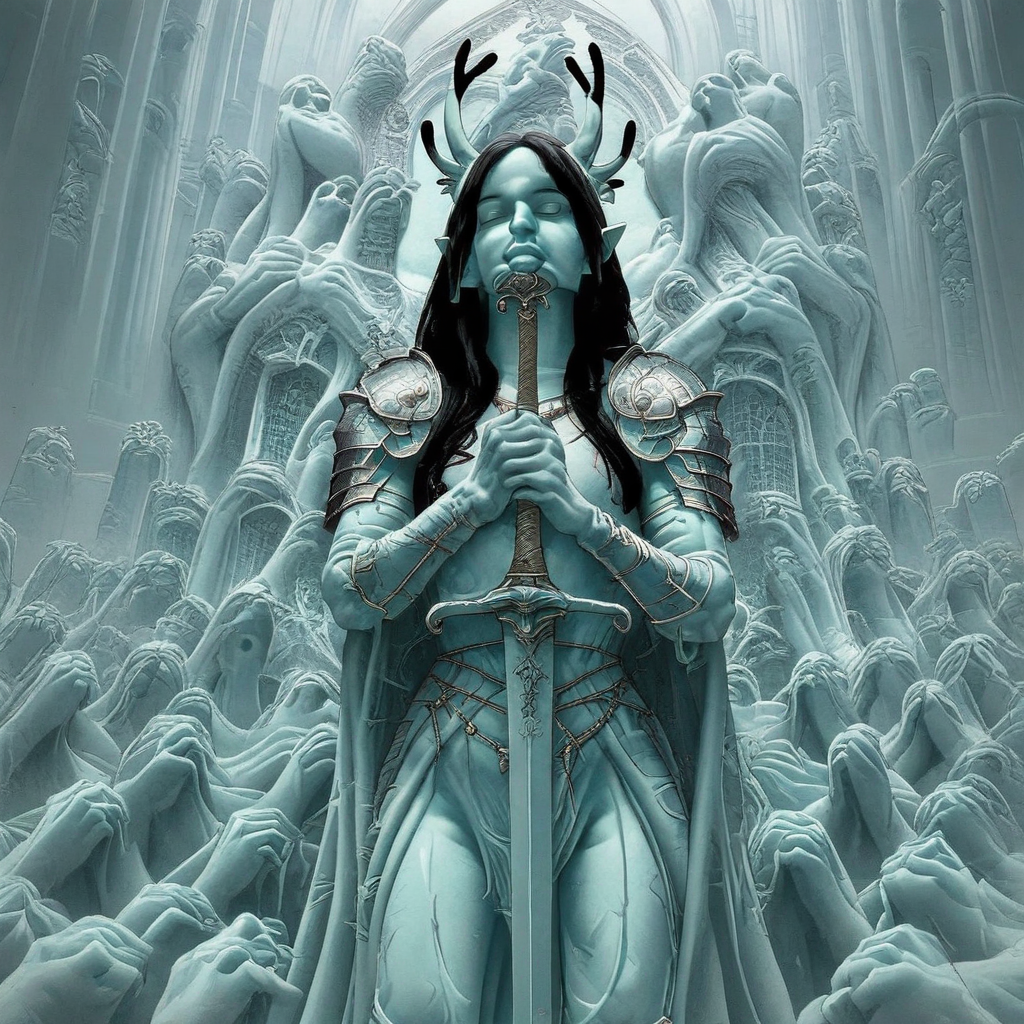 weapon, armor, sword, solo, 1girl, holding sword, holding weapon, closed eyes, white hair, holding