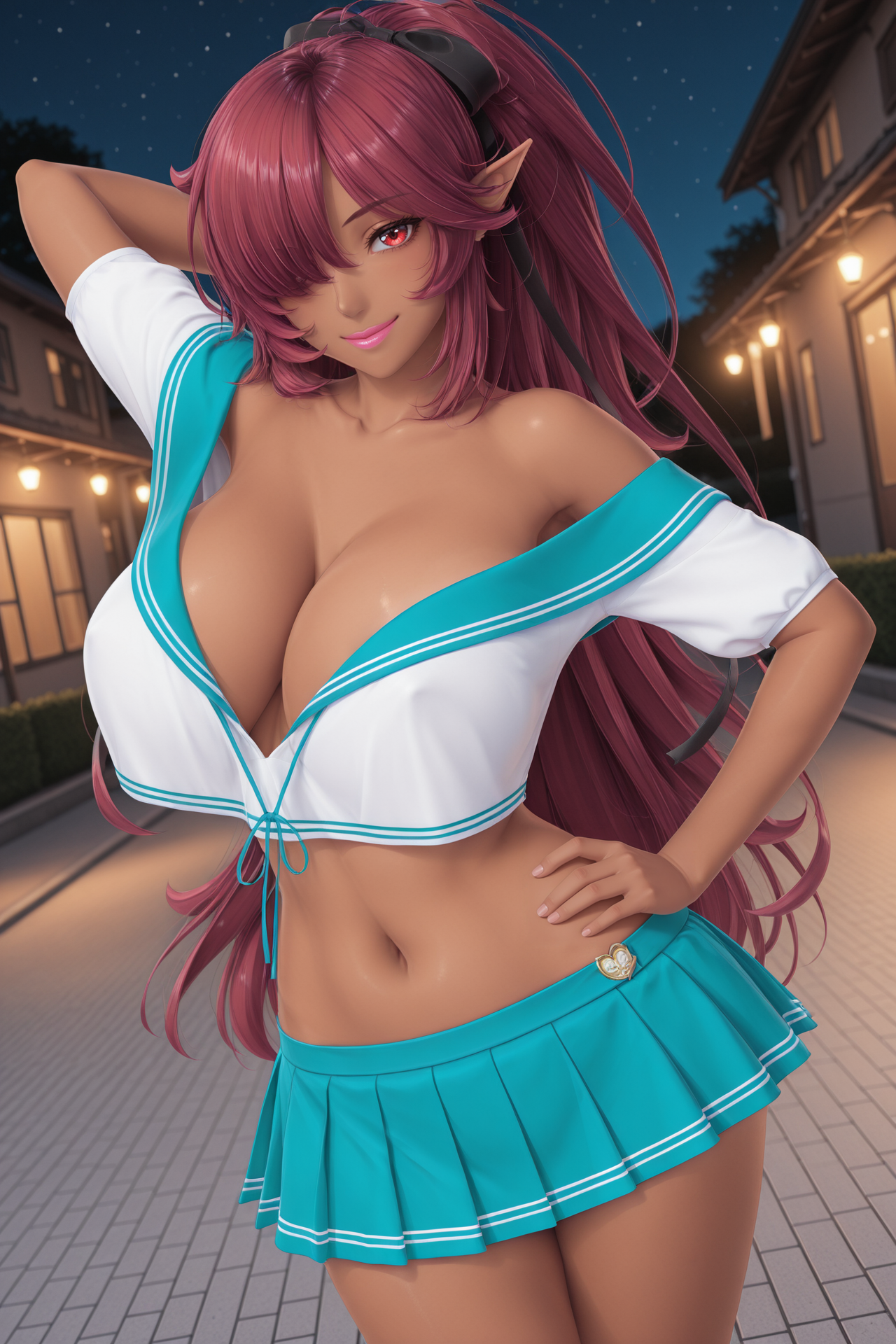 主提示词:1girl, solo, dark-skinned female, pointy ears, very long hair, red hair, hair over one eye, black hair ribbon, red eyes, huge breasts, narrow waist, wide hips, pink lipstick,
