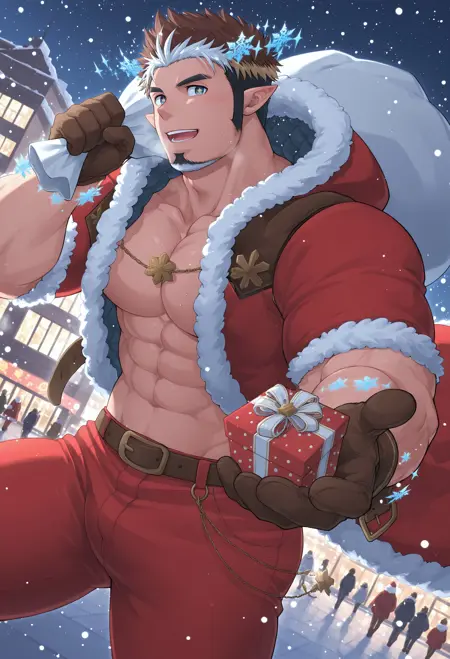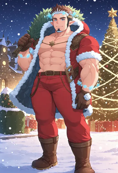 산타 의상, 빨간 재킷, 털 장식, 열린 재킷, 빨간 바지, 벨트, 갈색 장갑, 갈색 부츠