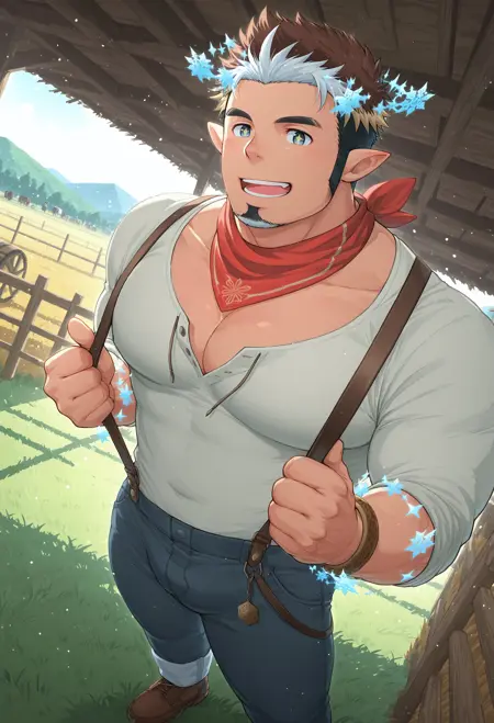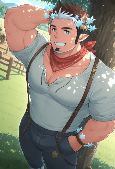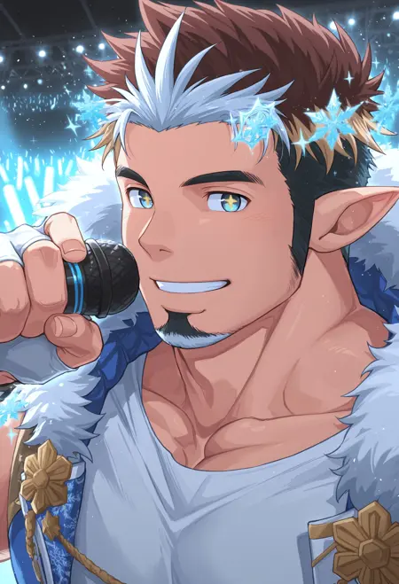 투톤 헤어, 다채로운 머리카락, 갈색 머리카락, 흰색 머리카락, 긴 수염, 파란 눈, 별 모양 동공, 노란색 동공, 얼굴 수염, 고티, 투톤 수염, 뾰족한 귀, 눈송이, 남성, 근육질 남성