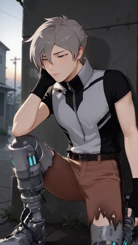 フラッシュバック衣装: M3rcFBf1t、シャツ、ジッパー、短袖、破れた服、茶色のパンツ、黒色手袋、フィンガーレス手袋、ベルト、機械式の足