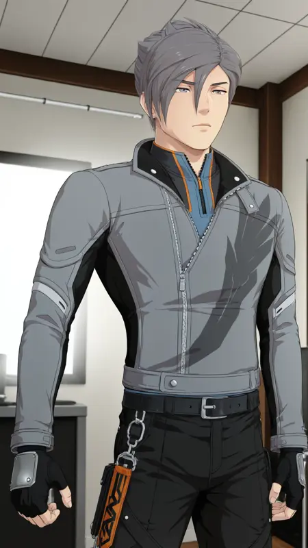 アトラス衣装: M3rcS4tlf1t、灰色のジャケット、カラー付きシャツ、長袖、ジッパー、ネクタイ、ベルト、黒色手袋、フィンガーレス手袋、黒色パンツ、黒色の靴