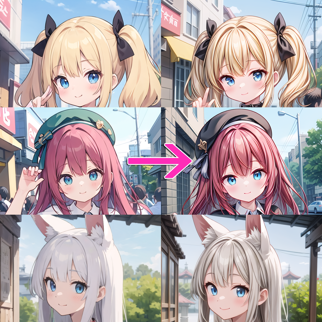 黒や青など、暗い髪の色を使用する場合、出力結果の髪の色が銀やピンクなどに変化してしまうことがあります。その場合、ネガティブプロンプトやNegPiP拡張機能を使って、出てくる髪の色(silver hair, pink hairなど)を抑制してみてください。
