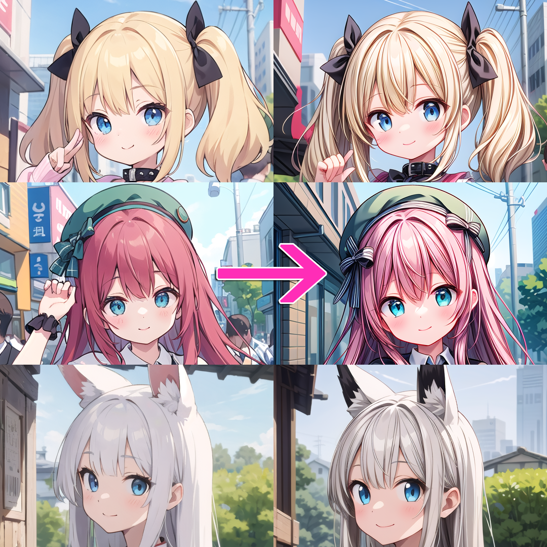 黒や青など、暗い髪の色を使用する場合、出力結果の髪の色が銀やピンクなどに変化してしまうことがあります。その場合、ネガティブプロンプトやNegPiP拡張機能を使って、出てくる髪の色(silver hair, pink hairなど)を抑制してみてください。