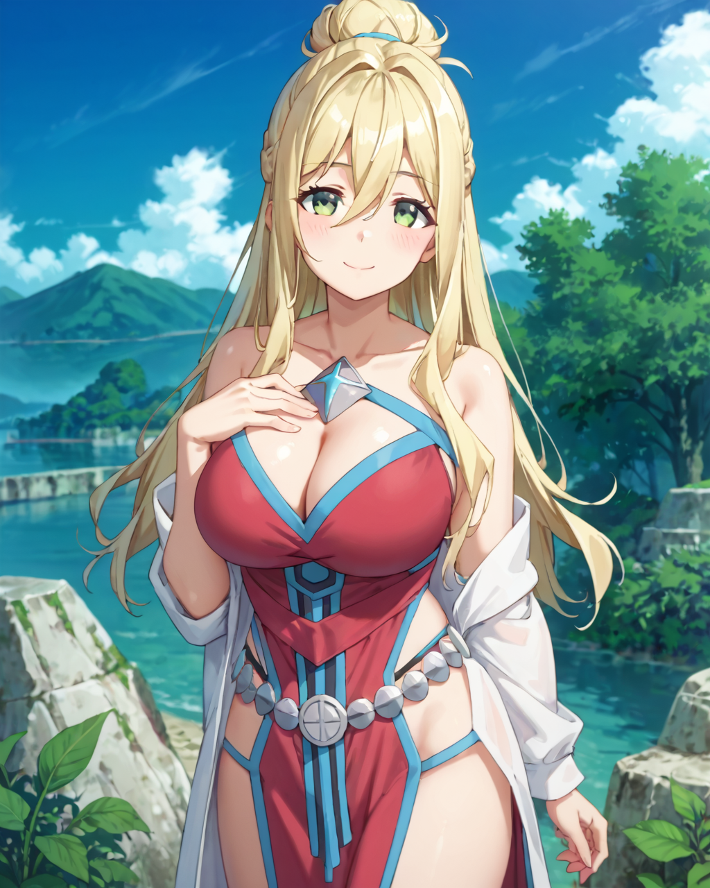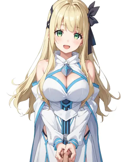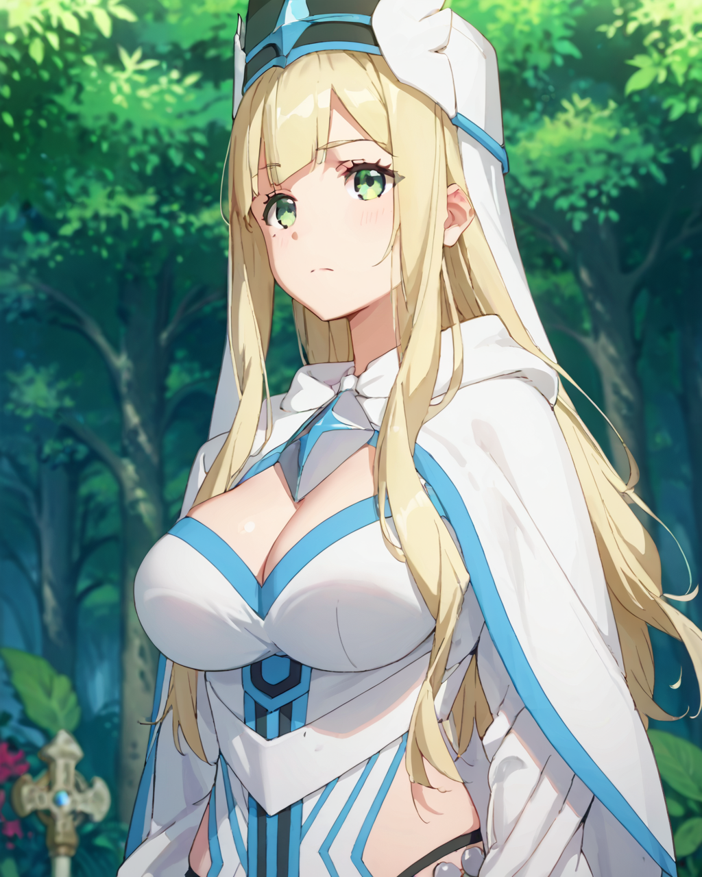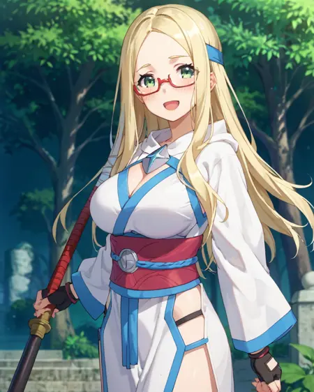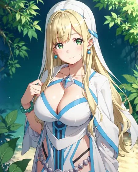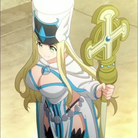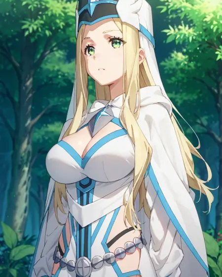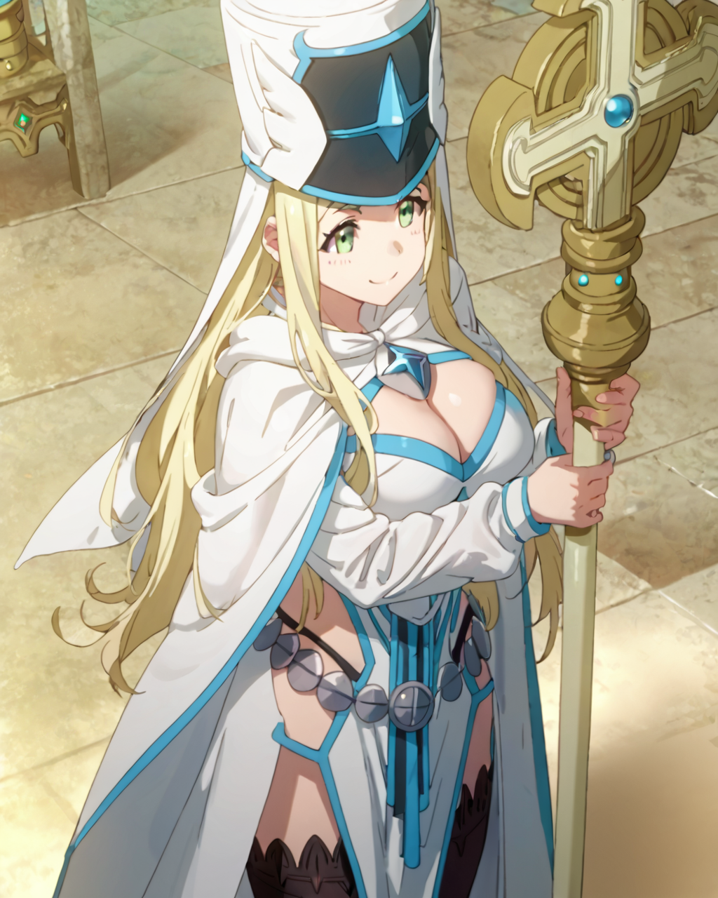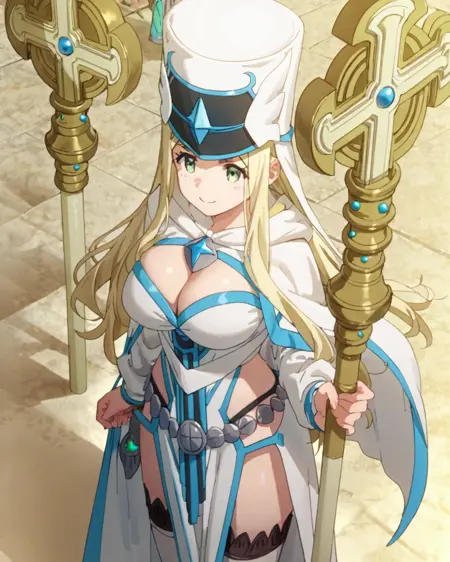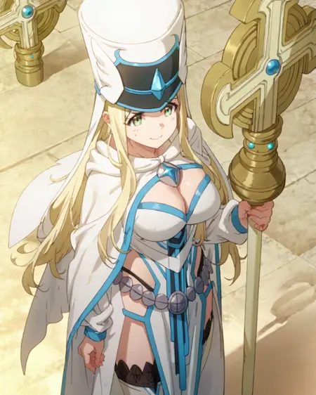 Misery,金发,长发,绿眼,乳房,大乳房,1个女孩,单独,帽子,乳沟,法杖,主教冠,微笑,斗篷,手持,手持法杖,过膝袜