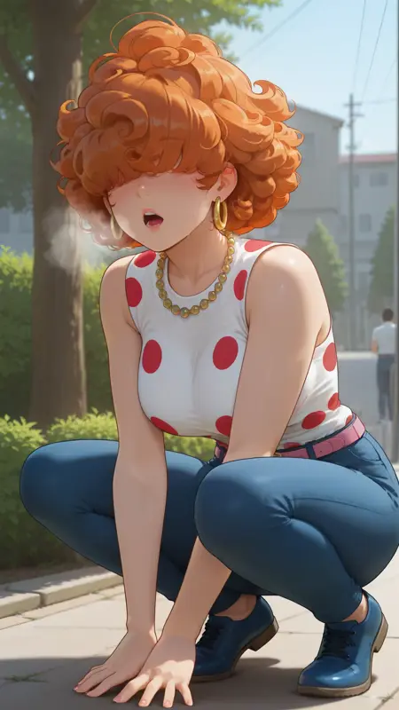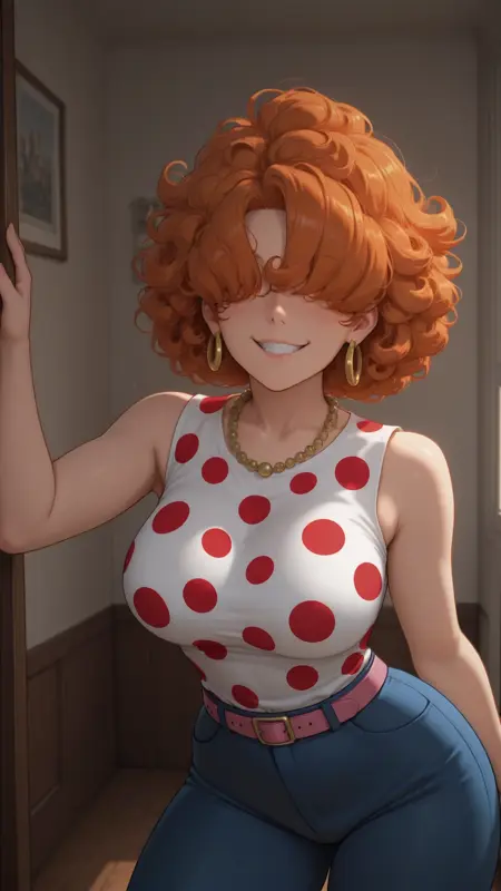 外观:L33K4NK3R,1女孩,橙色头发,卷发,头发遮住眼睛,眼睛被遮盖,圆环耳环,珠宝,项链