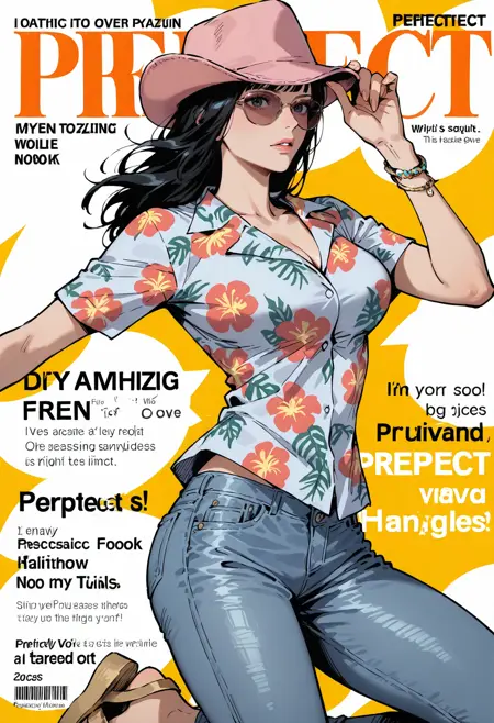 캐주얼 의상: 선글라스, 모자, 분홍색 머리장식, 팔찌, 가슴, 중간 크기 가슴, 큰 가슴, 셔츠, 짧은 소매, 하와이안 셔츠, 바지, 데님, 청바지, 샌들, 장신구
