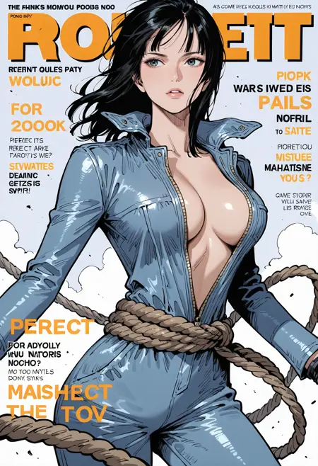 감옥 의상: 앞머리, 가슴, 중간 크기 가슴, 큰 가슴, 로프, 오픈 셔츠, 오픈 옷, 브라 미착용, 지퍼 풀림, 점프수트