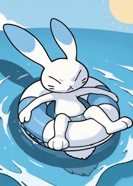 tail, furry, rabbit, rabbit tail, rabbit ears, white body, furry body, blue ears, white ears, whiskers, closed eyes,