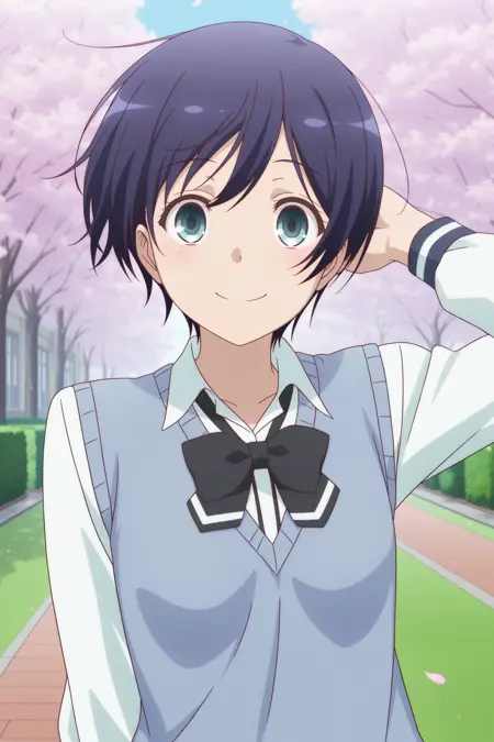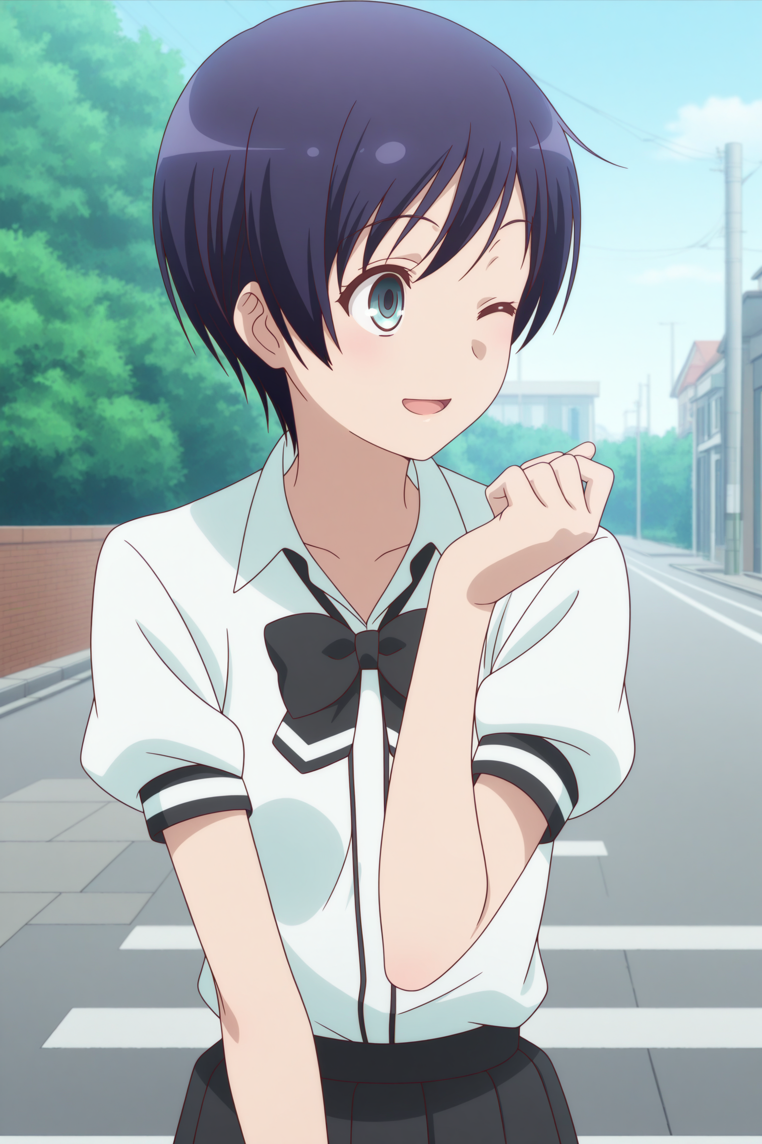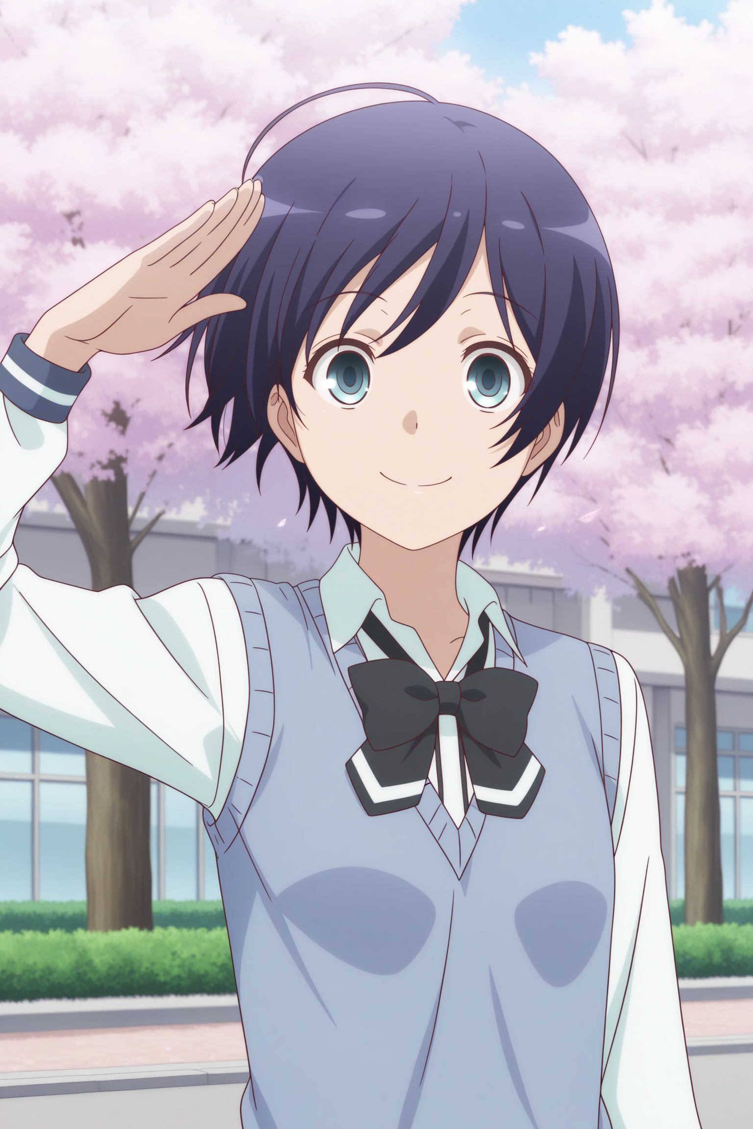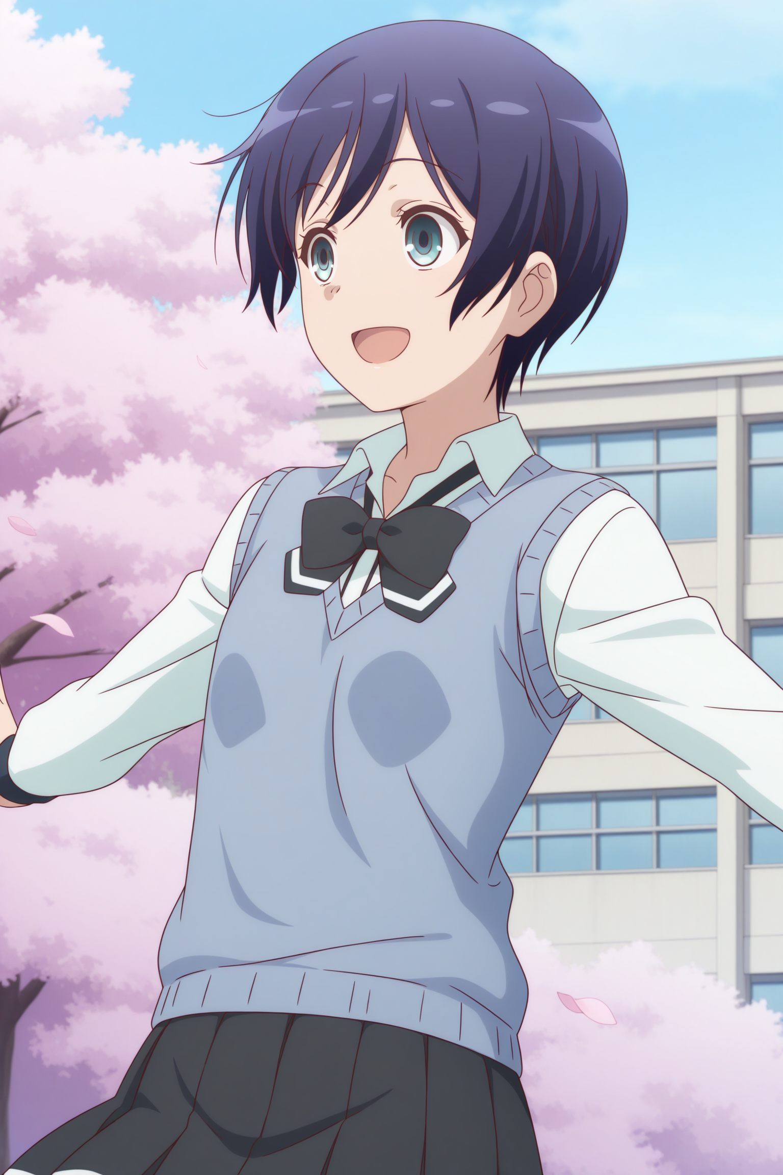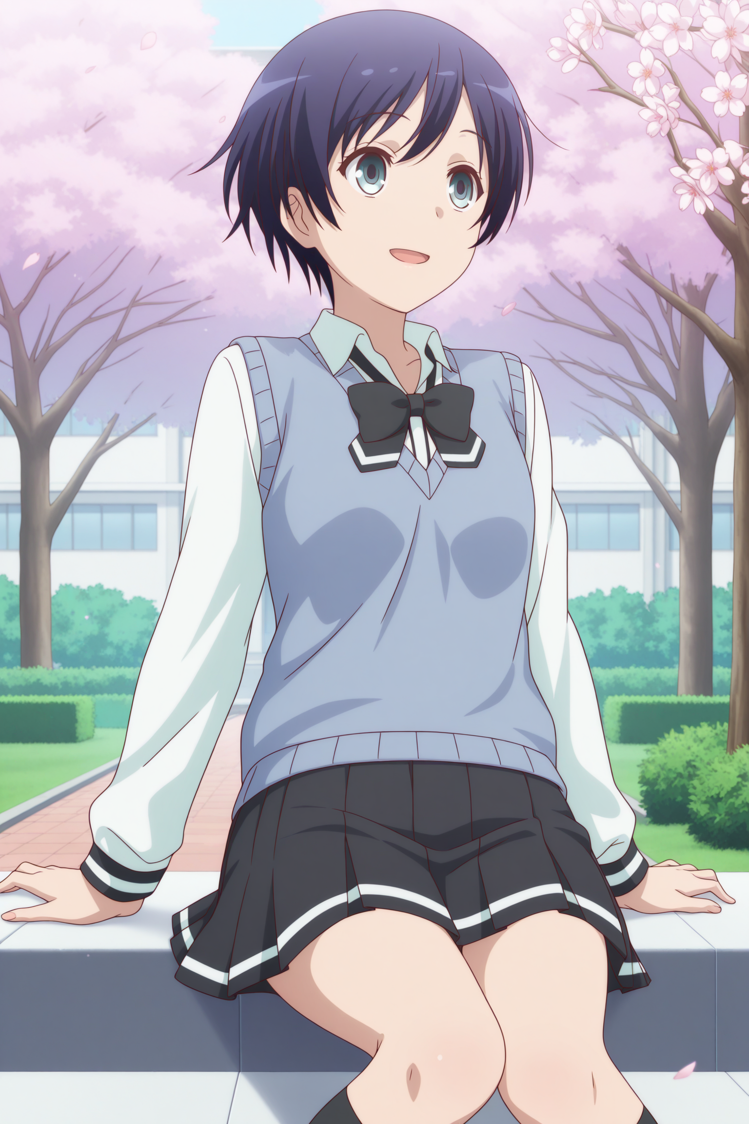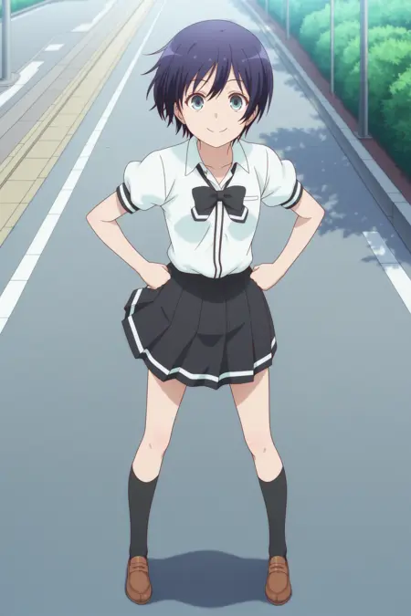 oosawa yuu, short hair, blue hair, partes bangs, aqua eyes, long sleeves, blue sweater vest, white shirt, collared shirt, black bowtie, loose bowtie, black skirt, striped skirt, pleated skirt, black socks, kneehighs, brown shoes, loafers