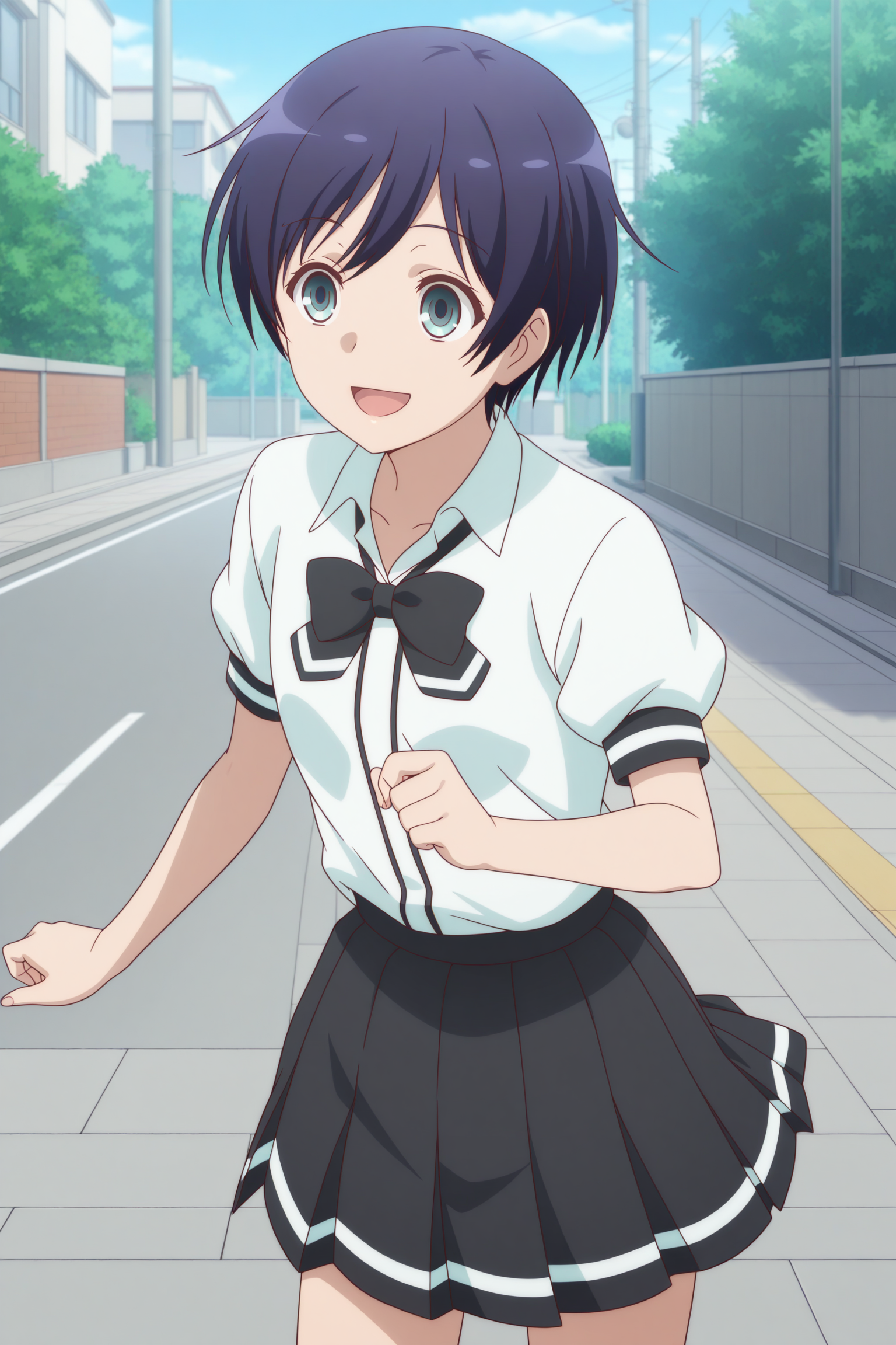 oosawa yuu, short hair, blue hair, partes bangs, aqua eyes, puffy short sleeves, white shirt, collared shirt, black bowtie, loose bowtie, black skirt, striped skirt, pleated skirt, black socks, kneehighs, brown shoes, loafers