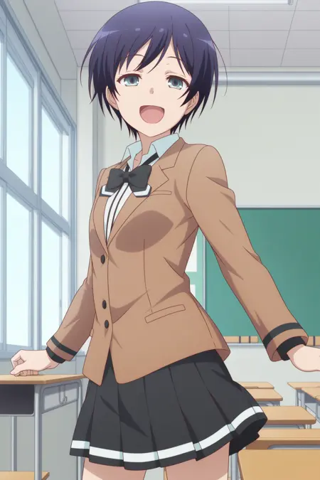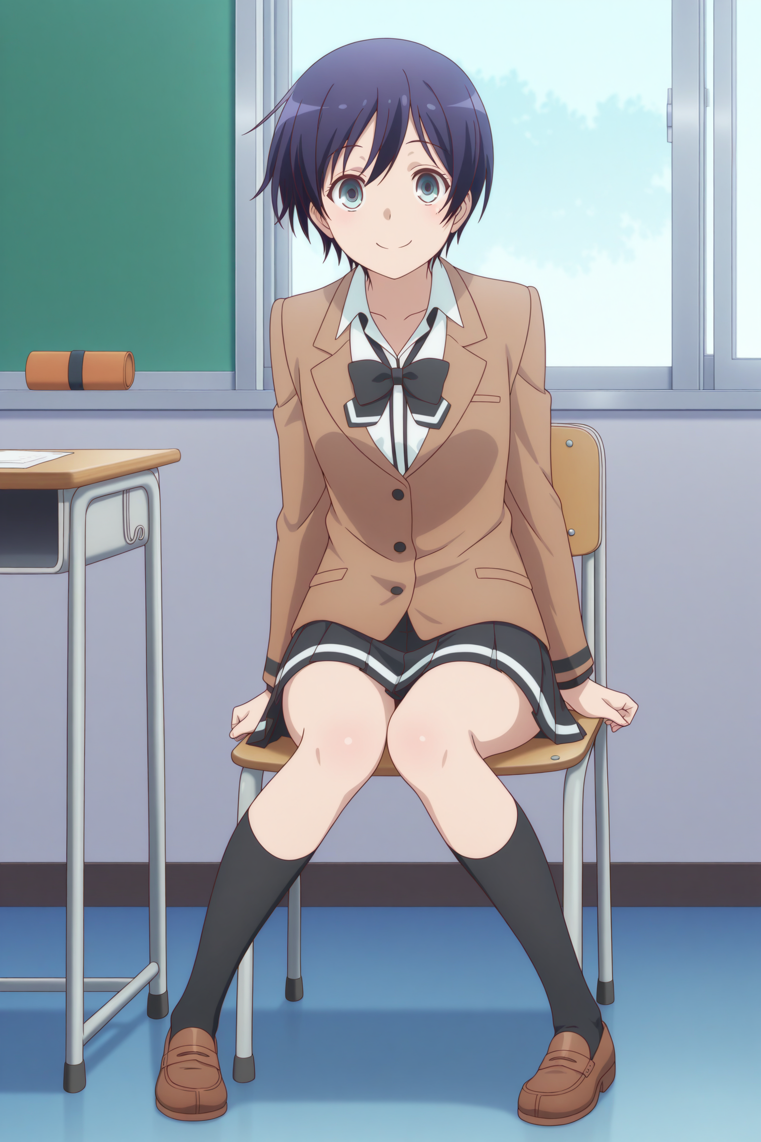 oosawa yuu, short hair, blue hair, partes bangs, aqua eyes, long sleeves, brown jacket, white shirt, collared shirt, black bowtie, loose bowtie, black skirt, striped skirt, pleated skirt, black socks, kneehighs, brown shoes, loafers