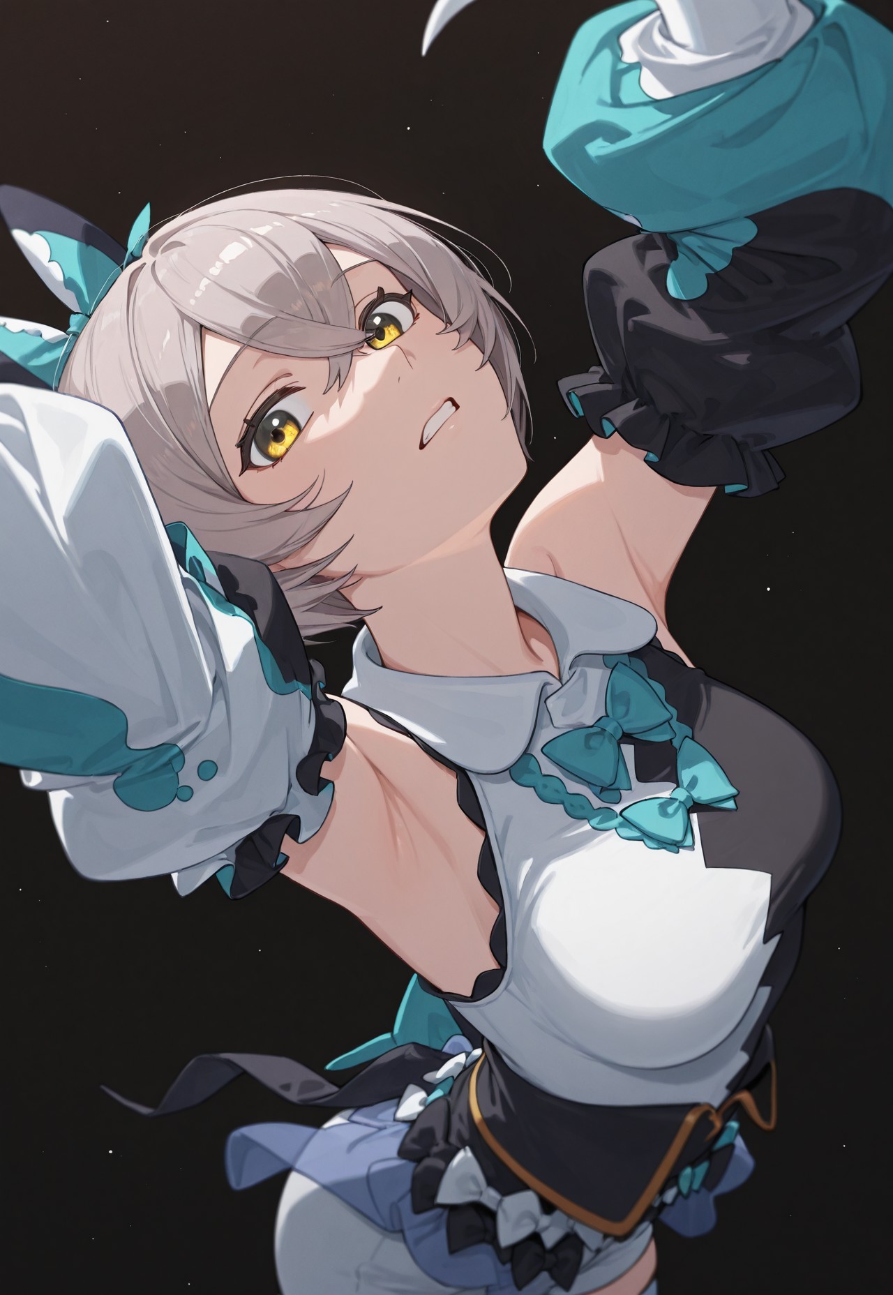 ayu_awaken, 단발머리, 노란 눈, 회색 머리, 리본 헤드, 이색 옷, 칼라 있는 옷, 중간 크기 가슴, 아쿠아마린 리본, 분리된 소매, 드러난 어깨, 긴 소매, 이색 소매, 볼륨 소매, 팔 전체 커버, 주름 소매, 흰색 반바지, 이색 허벅지 양말, 어긋난 신발, 플랫폼 힐, 손 전체 커버, 핀서