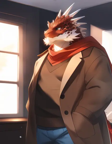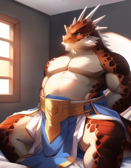 関連語:red skin, scales, white hair, short hair, facial hair, beard, yellow eyes, yellow sclera, slit pupils, dragon tail, dragon horns, spikes, claws, sharp fingernails, sharp toenails, old man, male swimwear, shorts, pelvic curtain, white cape, white cloak, belt, crown, necklace, jewelry, gem, blue gemstone, armlet, bracelet, earrings, ear piercing, anklet, ring, bangle, boots, gloves, santa hat, santa costume, fur-trimmed jacket, red jacket, red coat, red pants, red headwear, wizard, magic, wizard hat, witch hat, hat ornament, black headwear, star print, striped pants, vertical stripes, purple cape, hawaiian shirt, collared shirt, print shirt, short sleeves, sandals, straw hat, brown headwear, grey pants, brown sweater, black shirt, brown coat, blue pants, jeans, denim, brown apron, waist apron, open coat