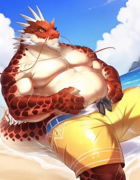 관련 단어: 붉은 피부, 비늘, 흰색 머리, 단발, 안면 수염, 수염, 노란 눈, 노란 공막, 수직 동공, 용 꼬리, 용 뿔, 가시, 발톱, 날카로운 손톱, 날카로운 발톱, 늙은 남자, 남성용 수영복, 반바지, 골반 커튼, 흰색 망토, 흰색 겉옷, 벨트, 왕관, 목걸이, 보석, 파란 보석, 팔찌, 팔찌, 귀걸이, 귀 piercing, 발목 고리, 반지, 뱅글, 부츠, 장갑, 산타 모자, 산타 복장, 털 장식이 있는 재킷, 빨간 재킷, 빨간 코트, 빨간 바지, 빨간 두건, 마법사, 마법, 마법사 모자, 마녀 모자, 모자 장식, 검은 두건, 별 무늬, 줄무늬 바지, 세로 줄무늬, 보라색 망토, 하와이안 셔츠, 칼라 셔츠, 프린트 셔츠, 짧은 소매, 샌들, 대나무 모자, 갈색 두건, 회색 바지, 갈색 스웨터, 검은 셔츠, 갈색 코트, 파란 바지, 청바지, 데님, 갈색 앞치마, 허리 앞치마, 오픈 코트