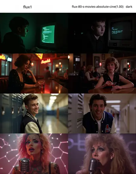 이 LoRA는 1980년대의懷舊적인 레트로 분위기를 가진 이미지로 변환합니다. 간단한 프롬프트만으로도 캐릭터를 대표적인 80년대 스타일로 재해석할 수 있습니다—볼륨 있는 헤어스타일, 오래된 스타일의 옷차림: 남성용 클래식한 박스형 정장, 여성용 파워 숄더 등... 전체적인 분위기는 아날로그 그레인을 더해 80년대의 고유한 느낌을 주면서도 이미지의 사실성을 보정합니다.