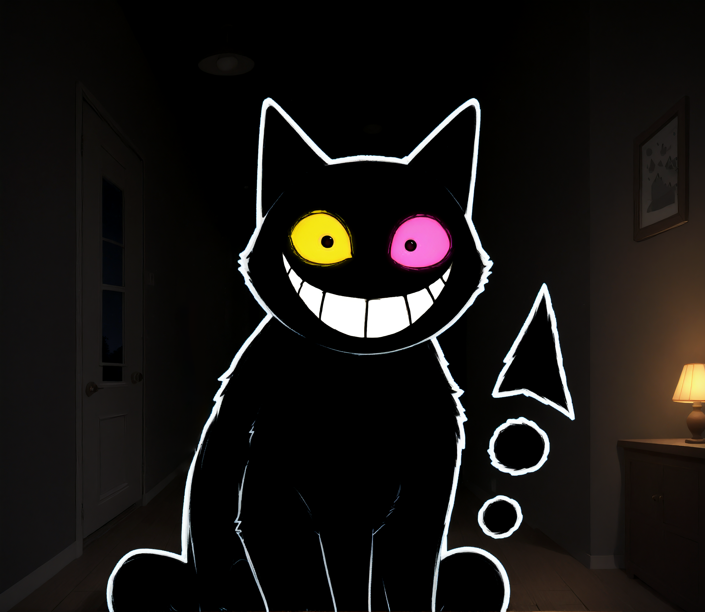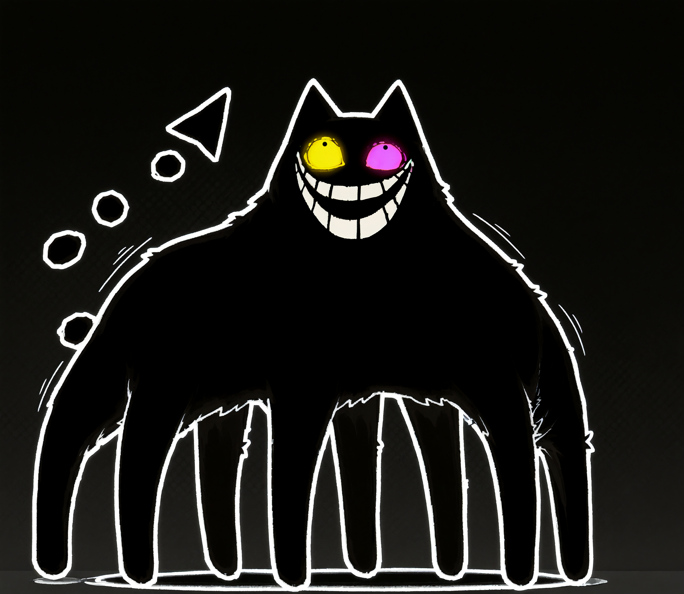 黑色毛发,异瞳,黄色眼睛,粉色眼睛,收缩的瞳孔,猫耳,无眉毛,野性,咧嘴笑,白色轮廓