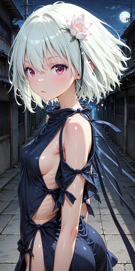 캐릭터: 렌-메인, 흰 머리, 드러나는 옷차림, 검은 드레스, 측면이 열린 옷, 머리 장식,
