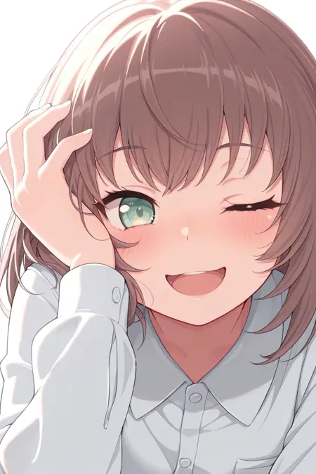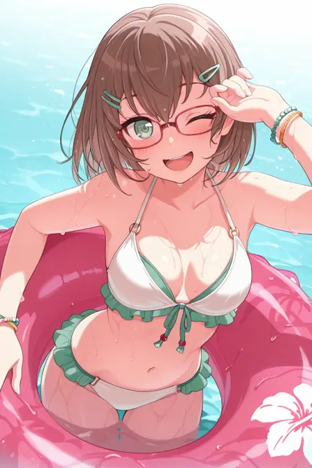 yamatomaya, 1girl, school uniform, skirt, solo, glasses, necktie, jacket, brown hair, green eyes, plaid skirt, plaid, blazer, striped necktie, shirt, red-framed eyewear, grey jacket, looking at viewer, striped, pleated skirt, haneoka school uniform