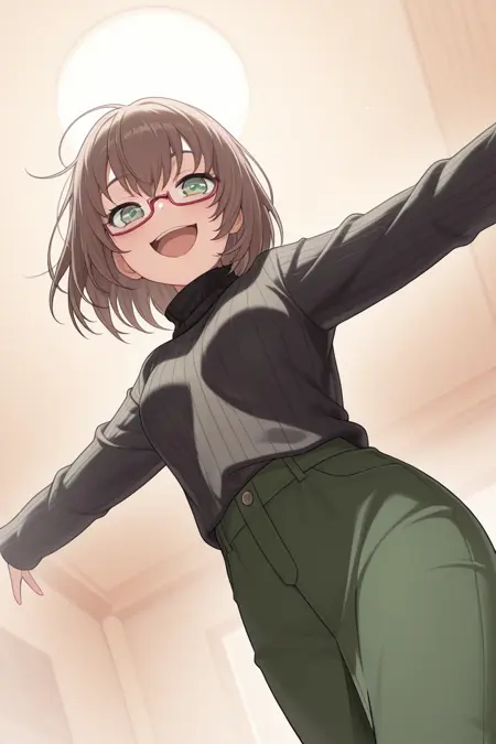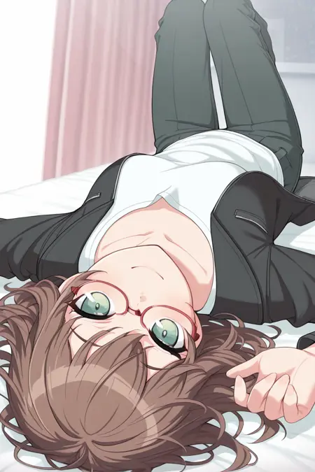 yamatomaya, 1girl, solo, gloves, headphones, glasses, hat, fingerless gloves, headphones around neck, clothes around waist, suspenders, brown hair, cabbie hat, looking at viewer, brown gloves, red-framed eyewear, jacket, semi-rimless eyewear, green eyes, white shirt, shirt, jacket around waist, under-rim eyewear, pants, cslsk