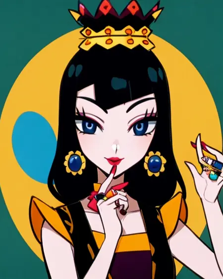 一个头戴王冠、头上还戴着一圈戒指的卡通角色,手中拿着一枚戒指,(1girl:0.949),(黑发:0.659),(蓝眼睛:0.678),(有色皮肤:0.510),(连衣裙:0.855),(耳环:0.975),(眼影:0.585),(手扶腰:0.627),(珠宝:0.933),(口红:0.967),(长发:0.535),(化妆:0.974),(独照:0.961),(白皮肤:0.657)