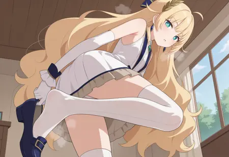 外見: 水色の目、白い瞳孔、金髪、前髪、非常に長い髪、サイドのアホ毛、波状の髪
