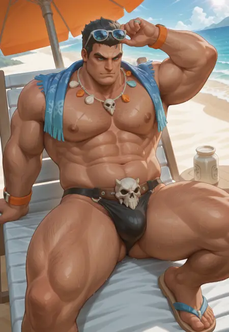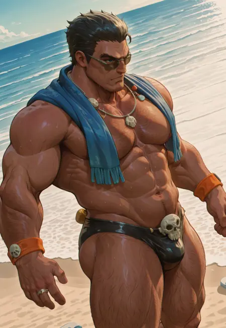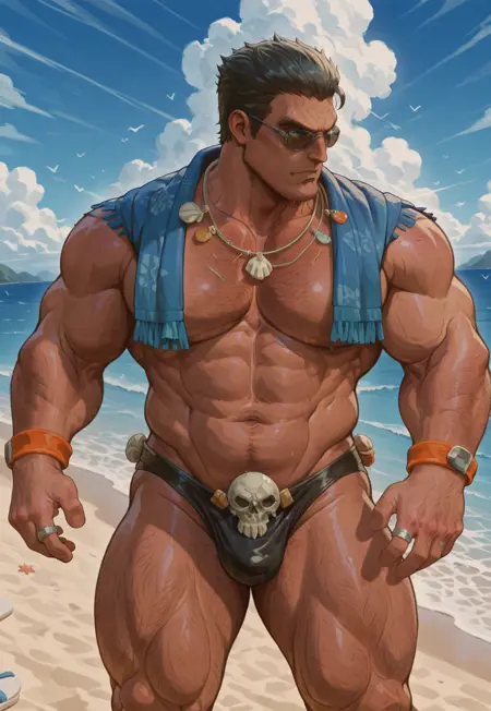 衣装:裸の胸、ラウンドサングラス、シェルネックレス、青いショール、フリンジトリム、ブラックビキニパンツ、ブラック水着、水着にプリントされたスカル、オレンジ色のブレスレット、指輪、スカルサンダル、首に巻いたタオル