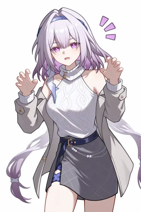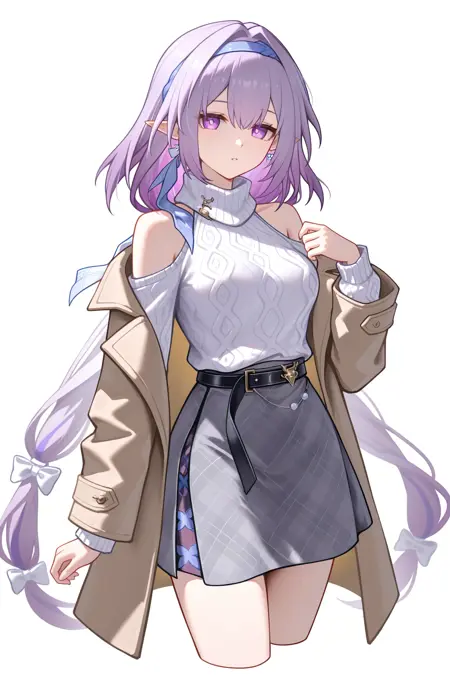 castorice \(luckin coffee\) \(honkai star rail\), 1girl, solo, pointy ears, purple hair, long hair, skirt, shoulder cutout, purple eyes, sweater, very long hair, belt, hairband, coat, bow, black belt, hair bow, clothing cutout, open coat, jewelry, long sleeves, earrings, plaid skirt, blue hairband, plaid, turtleneck, open clothes, brown coat, twintails, off shoulder, multicolored hair, alternate costume, breasts, grey skirt, bare shoulders