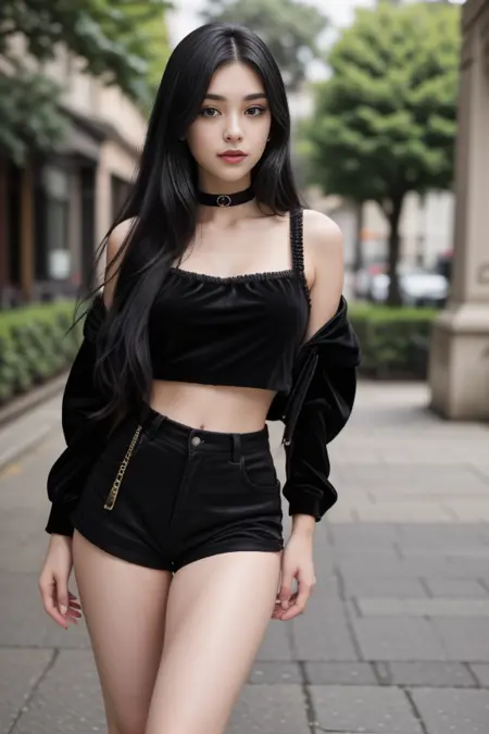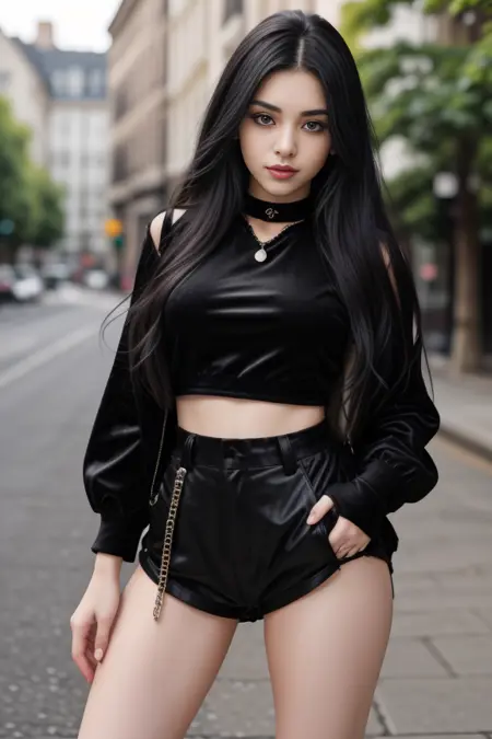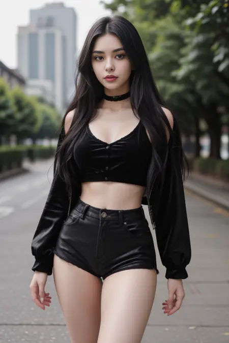Trigger Words = black-leather-shorts-syogi, black crop top, black jacket