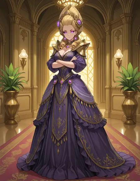 雅努斯地区完美无辜、敬畏皇帝的总督,来自《异端审判者》的维斯滕扎·维亚特。绝对不是疯狂的狂热信徒。主提示词为“RTVyatt”,关于她的发型和服装为“蜂窝式发型、紫色连衣裙、露胸”