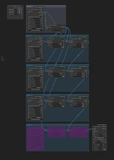 참고: 모든 비디오가 동일한 해상도이고 16프레임/초일 때 워크플로우가 가장 잘 작동합니다. 기본적으로 비디오 2~5를 첫 번째 비디오와 동일한 해상도로 조정하며, 화면 비율을 맞추기 위해 중앙에서 자르고, 선택적으로 최종 병합된 비디오를 원하는 해상도로 확대합니다. 32프레임/초로 프레임 보간을 선택적으로 적용할 수 있습니다. 다른 해상도나 프레임 속도를 원하시면 해당 노드를 수정해야 합니다.