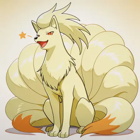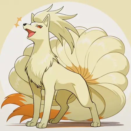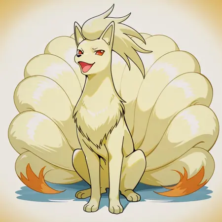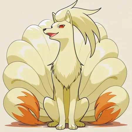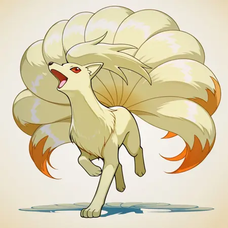 ninetales, pokemon (creature), light yellow fur, fox, nine tails, orange tail tips, quadruped, red eyes