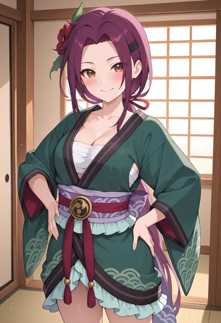 rukpcdef, 매우 긴 머리, 낮은 말머리, 머리핀, 머리 장식, 머리 꽃, 빨간 꽃, 어깨뼈, 짧은 기모노, 녹색 기모노, 검정 테두리, 보라색 끈, 주름진 끈, 문양, 빨간 리본, 사라시, 주름진 기모노, 넓은 소매, 신부용 장갑,