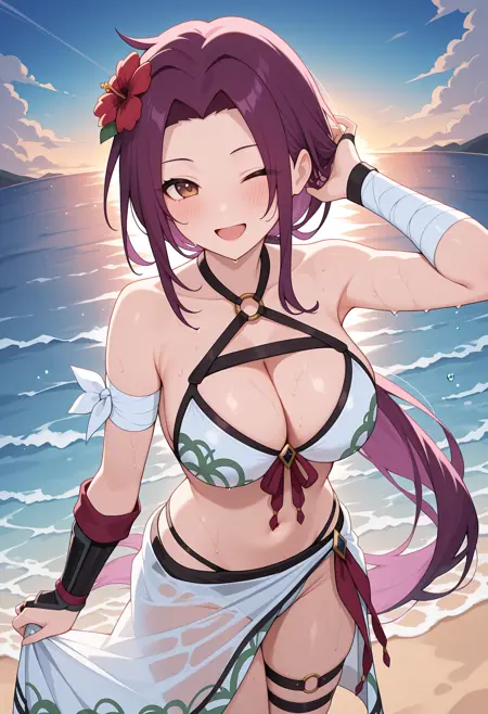 - rukpcsum, 매우 긴 머리, 낮은 말머리, 머리 꽃, 흰색 비키니, 검정 테두리, 프린트 비키니, O링 탑, 헬터넥, 흉부, 가슴 스트랩, 빨간 리본, 흰색 사롱, 붕대 감은 팔, 신부용 장갑, 여러 개의 허벅지 끈,
