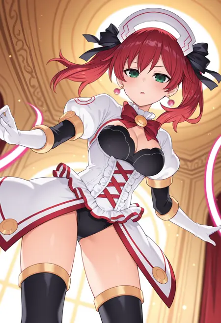 머리장식, 검은 리본, 검은 셔츠, 어깨가 드러난 셔츠, 가슴 노출, 빨간 리본넥타이, 보석, 흰 드레스, 빨간 장식, 주름진 코르셋, 주름, 볼륨 있는 짧은 소매, 긴 소매 위에 짧은 소매, 흰 스러그, 흰 소매, 검은 소매, 흰 장갑, 쇼걸 치마, 양면 원단, 옷 안의 레오파드, 검은 레오파드, 검은 히그스,