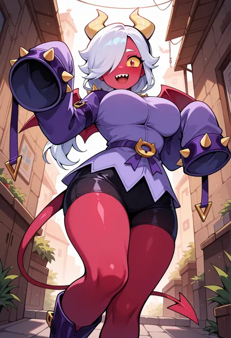 | Trained Words | trixiecolette, 1girl, demon horns, sharp teeth, demon tail, demon wings, colored skin, large breasts, yellow sclera, hair over one eye, demon girl, spikes, boots, white hair, freckles, sleeves past wrists, sleeves past fingers, purple footwear, yellow horns, spiked bracelet, long hair, long sleeves, black shorts, bike shorts, purple jacket, ponytail,Copied! |
