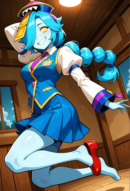 | 训练词汇 | inspectorcolette, 1girl, qingdai guanmao, ofuda, blue hair, yellow eyes, hair over one eye, sharp teeth, hat, blue skin, purple necktie, skirt, long hair, grin, jiangshi, no pupils, yellow sclera, purple necktie, blue vest, white shirt ,blue skirt, pleated skirt, shoes, red footwear, single shoe, barefoot, name tag, medium breasts, braided ponytail, ponytail, hair over one eye, one eye covered, juliet sleeves, long sleeves, puffy sleeves,已复制! |