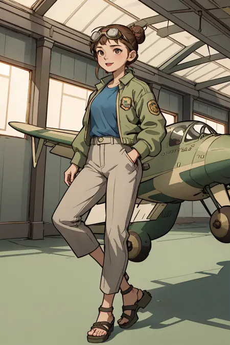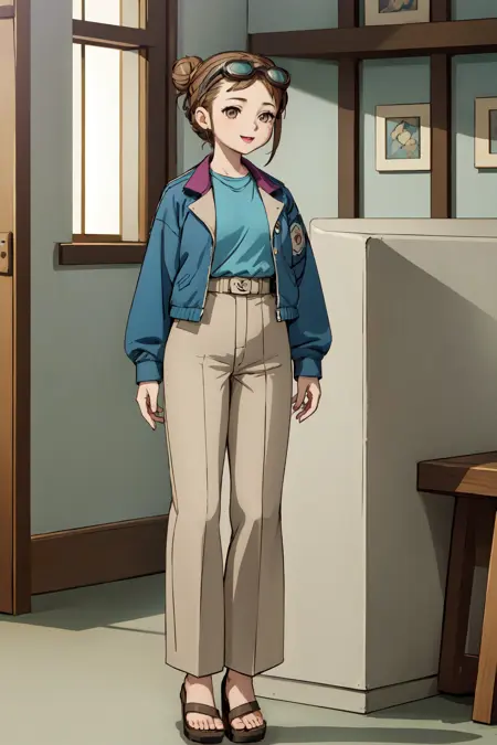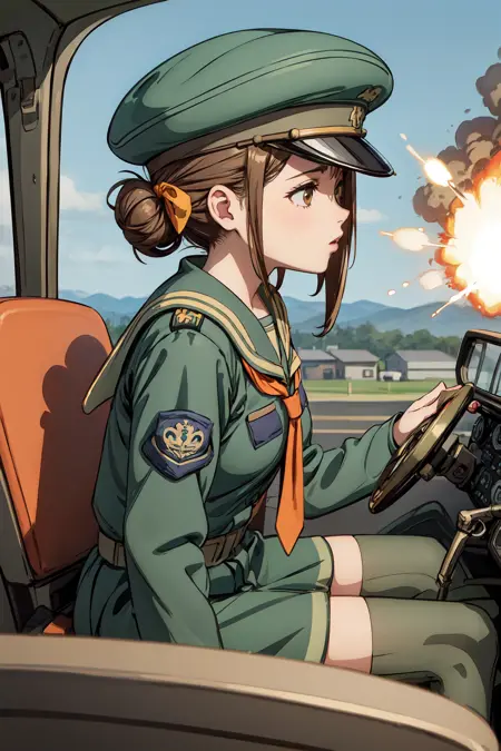 トリガーフレーズは「RivetProgear」です。彼女のゲーム衣装には「Uniform,school uniform,serafuku,sailor collar, green uniform,orange necktie,hat,single hair bun,skirt,pantyhose,boots」を推奨します。