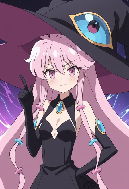 - 女巫帽,第三只眼,黑色连衣裙,无袖连衣裙,胸部露出,胸针,蓝色宝石,可拆卸衣领,黑色衣领,露肩,肘部手套,黑色手套,