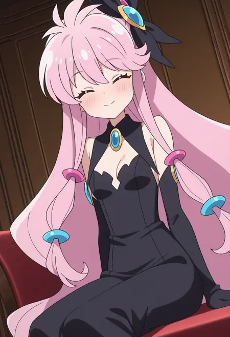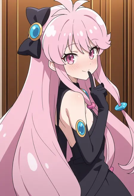 头饰,发带,蝴蝶结,侧边蝴蝶结,黑色连衣裙,无袖连衣裙,胸部露出,胸针,蓝色宝石,可拆卸衣领,黑色衣领,露肩,肘部手套,黑色手套,